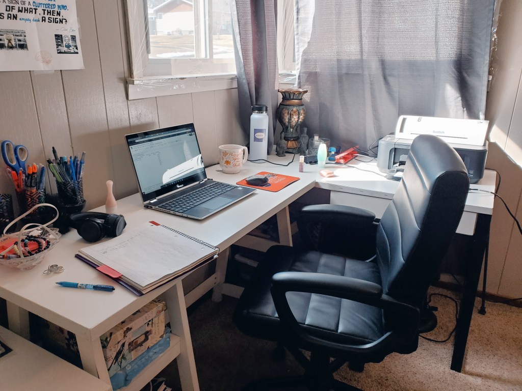 My home office. I finally got a new (better) office chair after my son hijacked my old one!